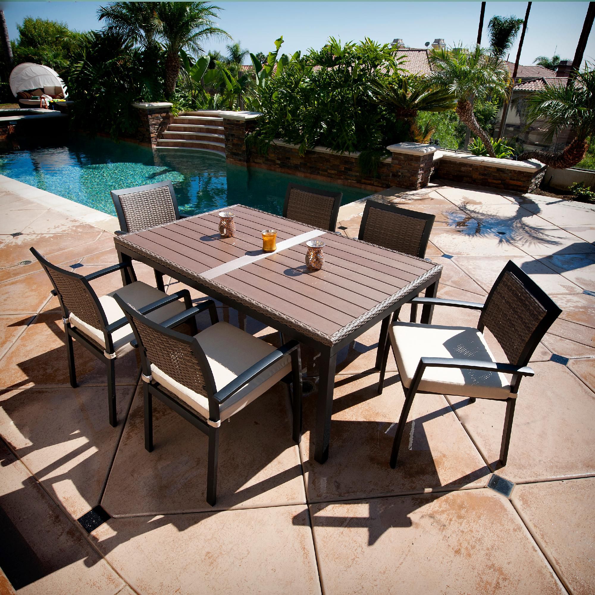 The Zen 7pc Dining Collection is the perfect way to dine in style in your backyard retreat. Rich deep espresso colored hand woven rattan frame wraps around this casual and moderately contemporary design. Clean lines with large symmetrical block shaped legs compliment your back yard setting and provide ample seating for 6 adults or even more. Unique Polystyrene extruded faux wood slatted table top looks like real wood but easily withstands the elements. Sub frame is constructed from lightweight yet durable aluminum frame. Espresso weave matches the rest of the Zen Collection. Sunbrella seat cushions in Heather Beige included. Large diameter umbrella hole in center table slat allows you to add large pole umbrella. Lightweight and durable cast aluminum frame powder coated in matte black finish. Hand woven commercial grade PE rattan in weathered grey. UV weather and color fast fade resistant. Holds up great in salt and chlorinated environments. Perfect for coastal living. Virtually maintenance free simply rinse it clean with a hose and mild cleanser. One Year Manufacturer s Warranty agains defects in materials or workmanship.